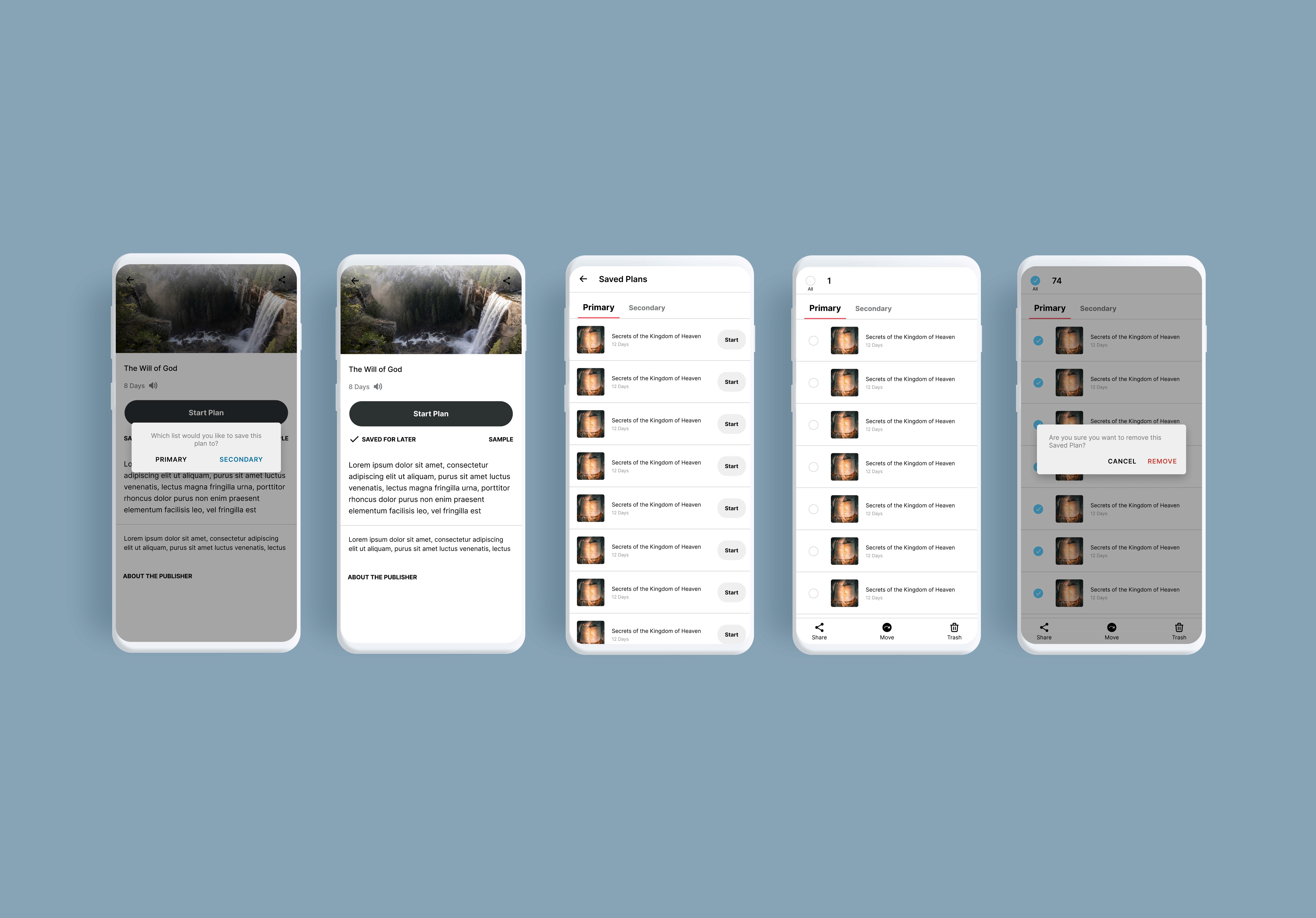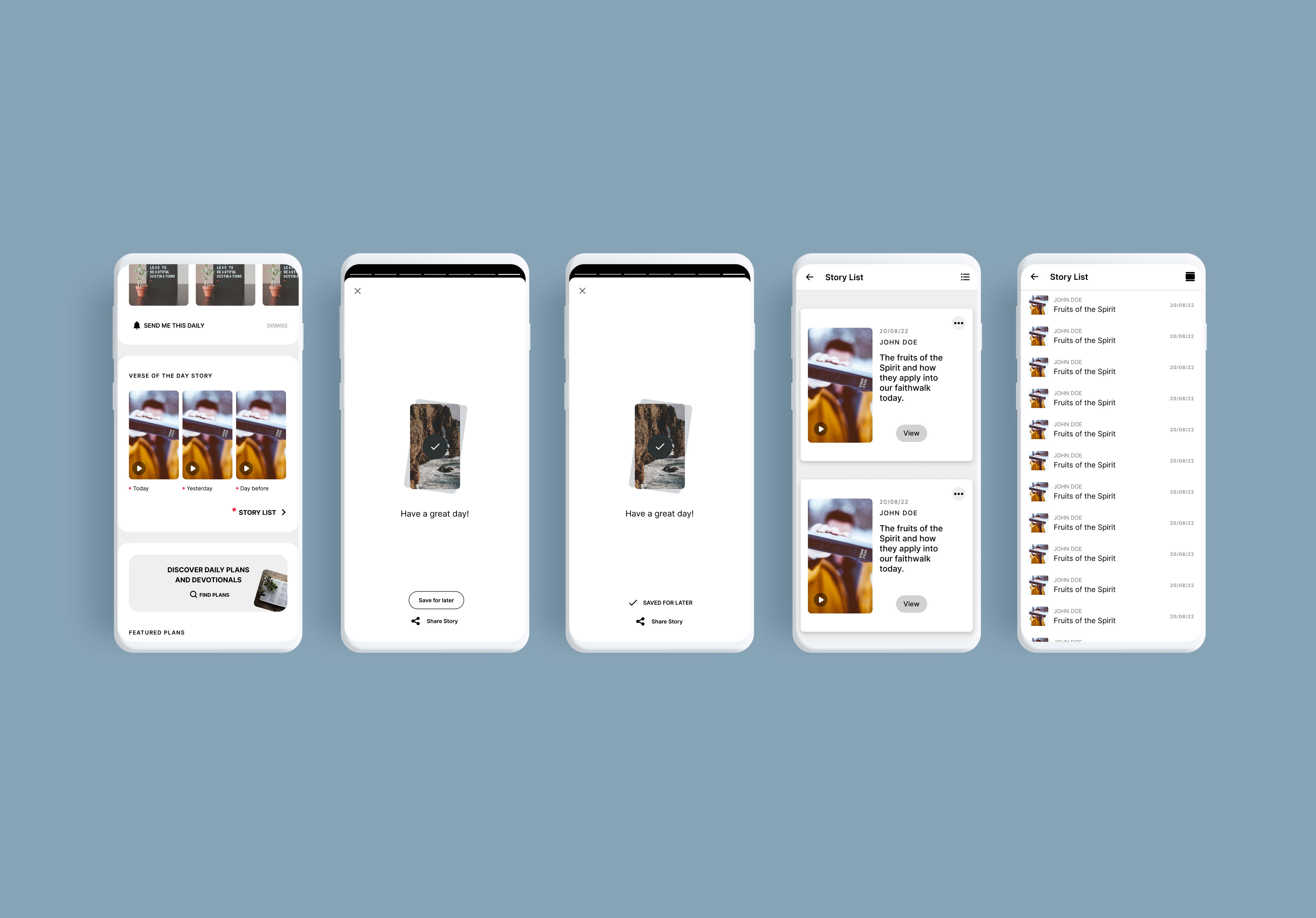 In this section, I decided to go with the outlined button because it would catch the user's eye and it looked more clear that it was a clickable button. I also used the 'saved for later' button, which is usually shown when saving a plan, so that it has that consistency and familiarity with the users. For the story list, I was able to base my designs on the prayer list and so that also was based on having a consistent design/functionality for the app.