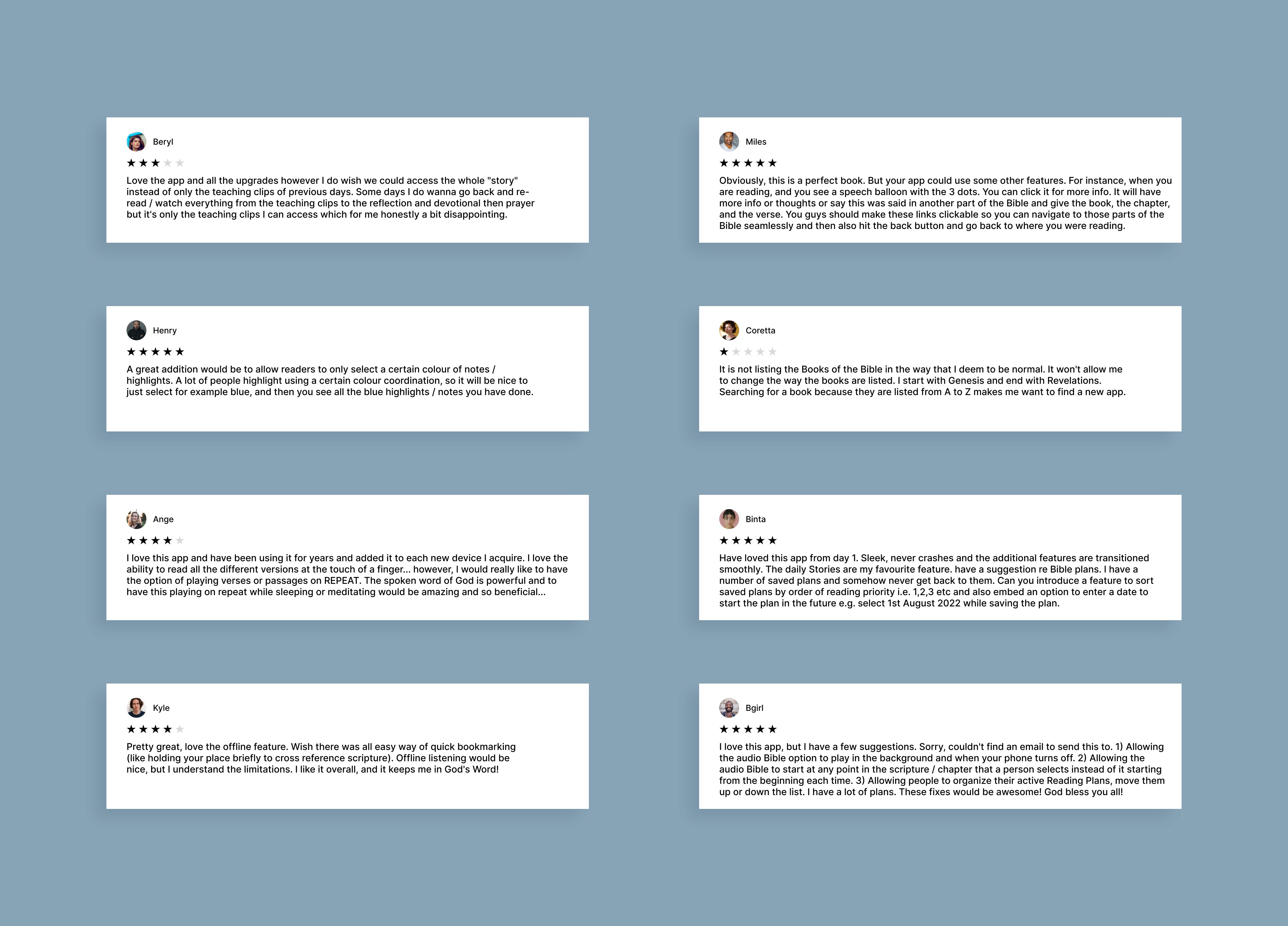 To start, I did some research into the current users pain points by going to the app's Google Play reviews. This gave me a broad range of reviews which helped me to understand some of the users and their experiences with the Bible App. As I continued to log what problems or suggestions that users had, I was able to pinpoint a select few that would improve the user's experience.