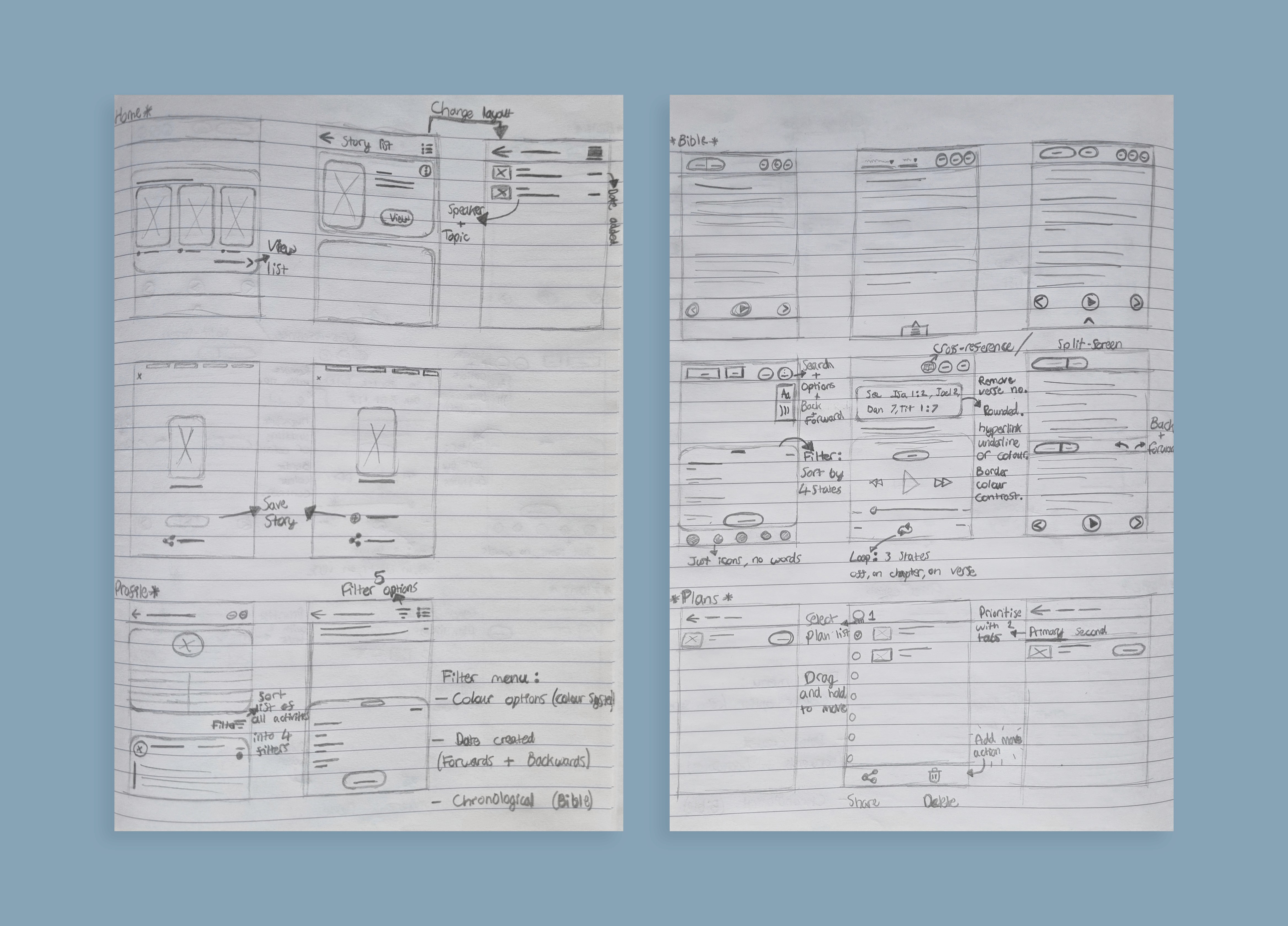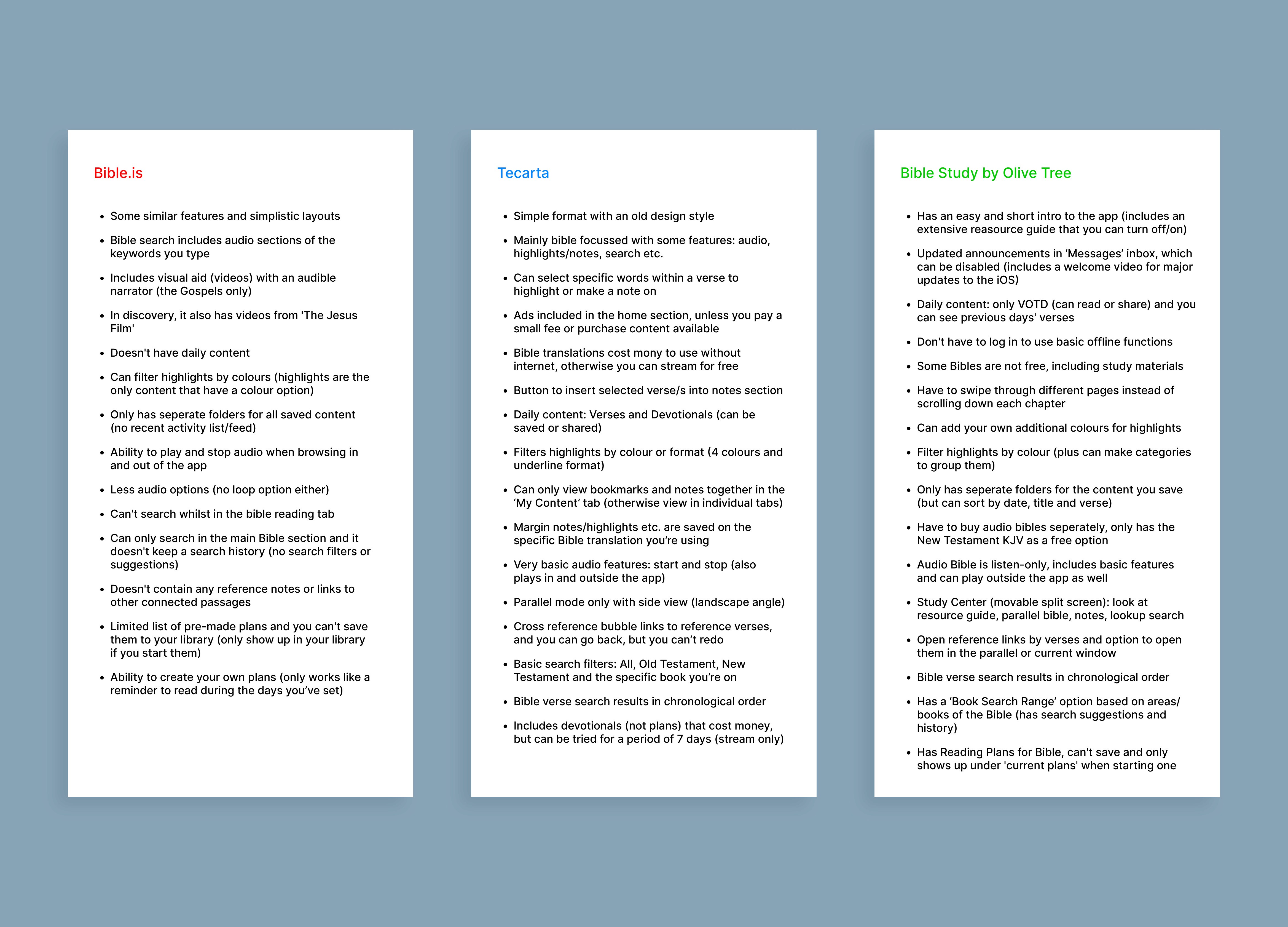I did some research into other competitors and tested these applications to see how they functioned and what features they had, or ones they didn't have compared to the You Version Bible App. This helped me to thoroughly evaluate how the other Bible-based applications worked and what made them stand out. Also, I was then able to use some of the features as inspiration for the ideas I would create for the improvements of the Bible App.