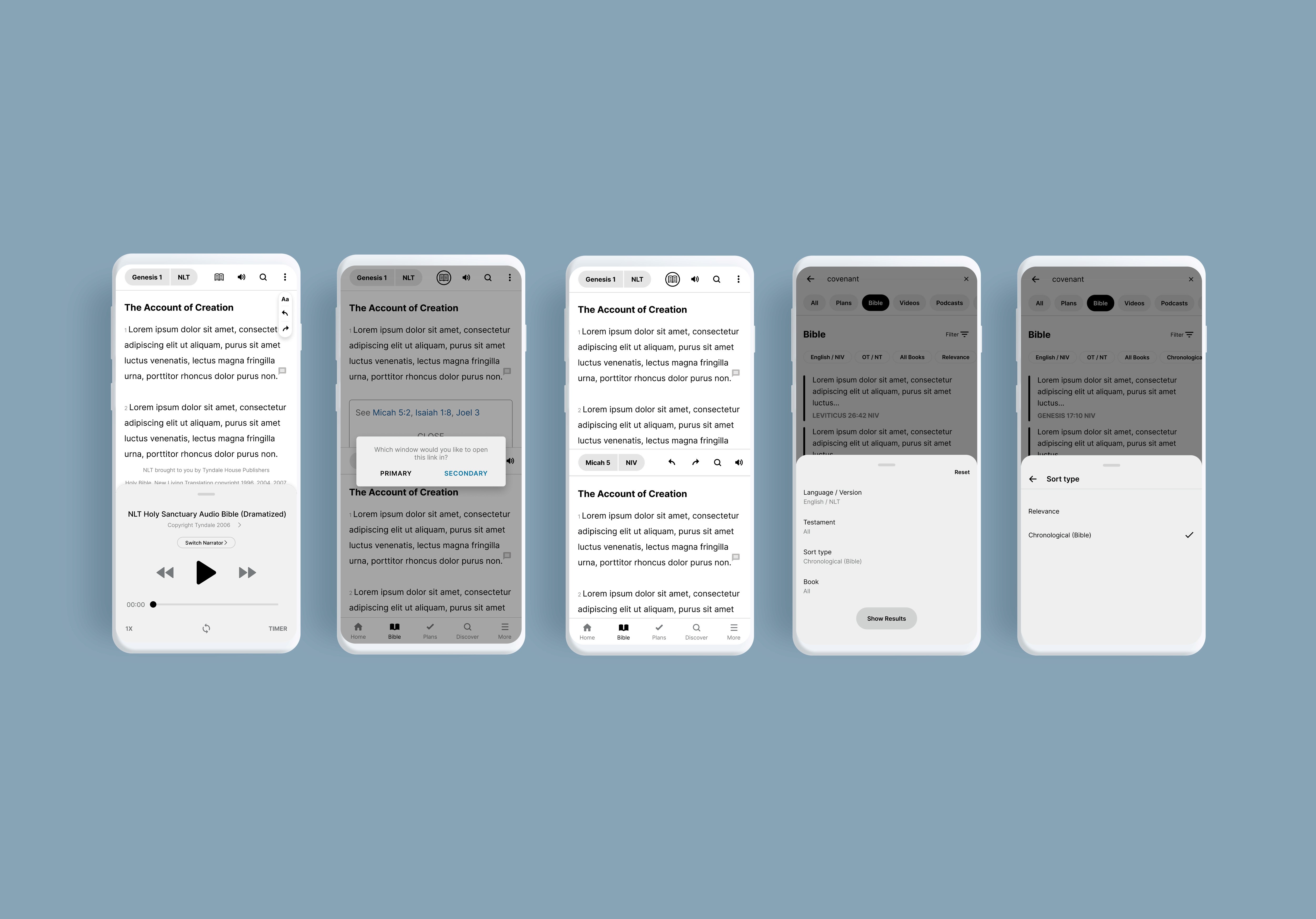With the top bar, I rearranged and added some options for the buttons. The cross-reference button would open up the split screen mode and have a black outline to show users that it's active. I moved the formatting button into a small dropdown menu along with an undo and redo button so users can go back and forth between the scriptures they read. For the audio overlay, I added a loop button with three modes (loop off, on verse, and on chapter) so users can listen to the parts of the Bible they want on loop. I created an overlay when pressing each Bible link to ask the user if they wanted to open it in the primary or secondary window, so they can choose where they might want to cross reference. For the Bible search section, I added a 'sort type' filter option for users to see the search results in chronological order or by relevance of the keyword they typed.