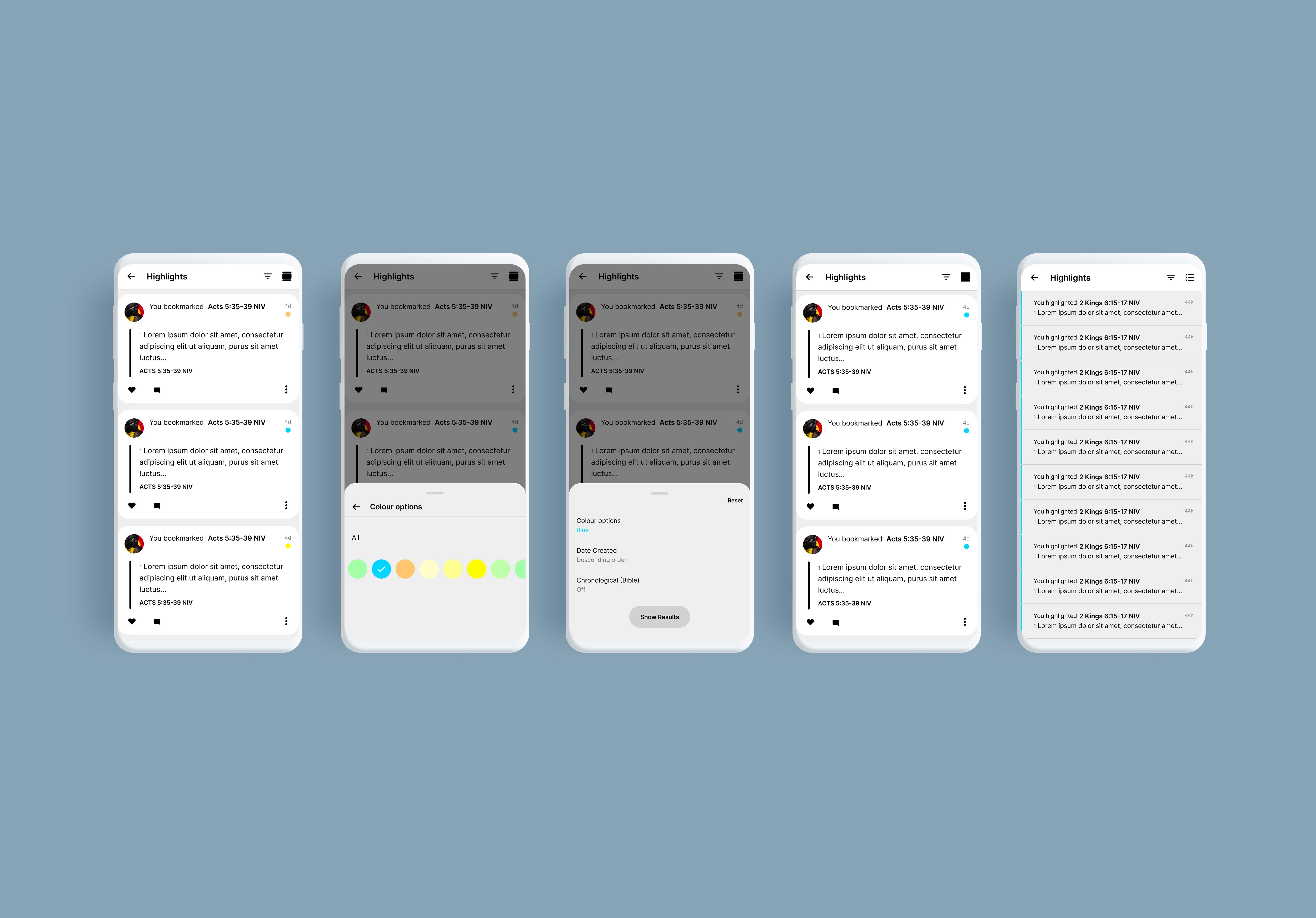 With the profile section, I designed it to include a filter button to open up an overlay, which is based on the Bible search filter overlay from the Bible section. Since the highlights, bookmarks and notes can be made with different colours, I used the same colour system in the filter as the one in the Bible section. I also added the options to change the order of the date you created it and the Biblical chronology. This would help users to filter through highlights, bookmarks and notes they have made with specific colours, or the ones they made a long time ago, without having to scroll through them all.
